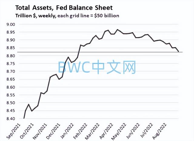 自9月起,美联储QT(量化紧缩)的规模比之前大约翻了一番,缩减美国国债上限翻了一番,达到每月 600 亿美元,缩减MBS (抵押支持证券)达到 350 亿美元。而根据美联储9 月1日公布的截至 8月31 日的每周资产负债表的总资产已经降至8.83 万亿美元,为1月12 日以来的最低水平。
