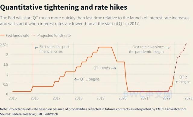 有经济学家认为,此后缩表一旦达到最大速度,接下来每年的资产负债表缩减幅度将超过 1.1万亿美元。有经济学家认为,美联储的目标或将在三年内实现约4万亿美元的总资产负债表收缩,美联储或在2025年资产负债表重新回到4.5万亿美元的原位。而通过下图,我们可以看到,美联储本轮QT的规模将超过以往任何一次货币紧缩。